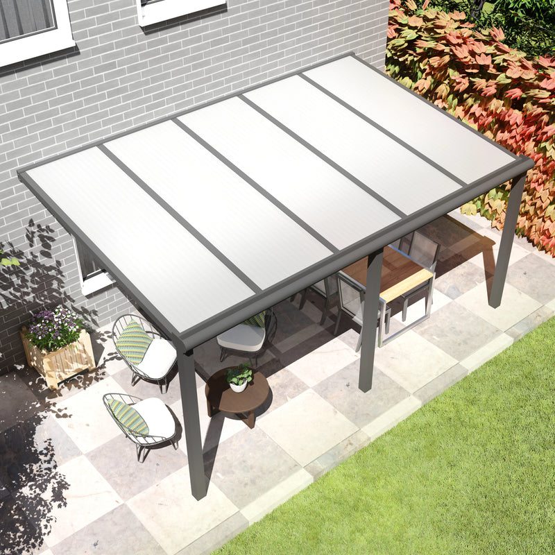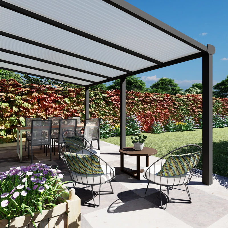De Deluxe terrasoverkapping is tot in de perfectie afgewerkt en leverbaar tot een breedte van wel 7 meter uit één stuk. Deze Deluxe terrasoverkapping is in de kleur antraciet en dakplaten van Opaal polycarbonaat.