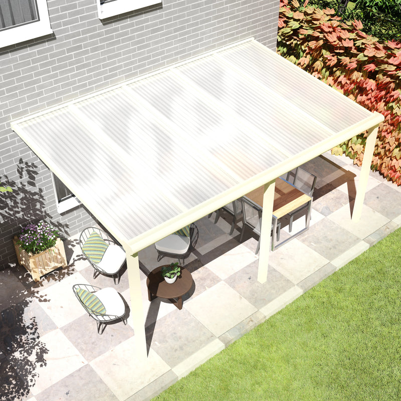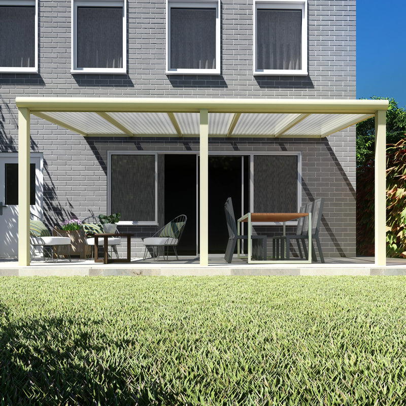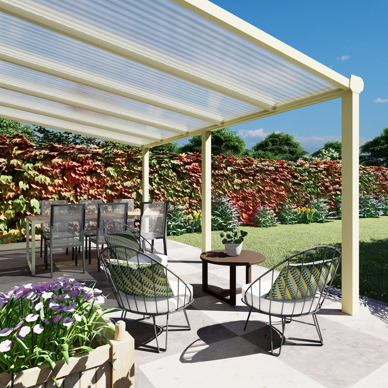 De Deluxe terrasoverkapping is tot in de perfectie afgewerkt en leverbaar tot een breedte van wel 7 meter uit één stuk. Deze Deluxe terrasoverkapping is in de kleur crème wit en dakplaten van Helder polycarbonaat.
