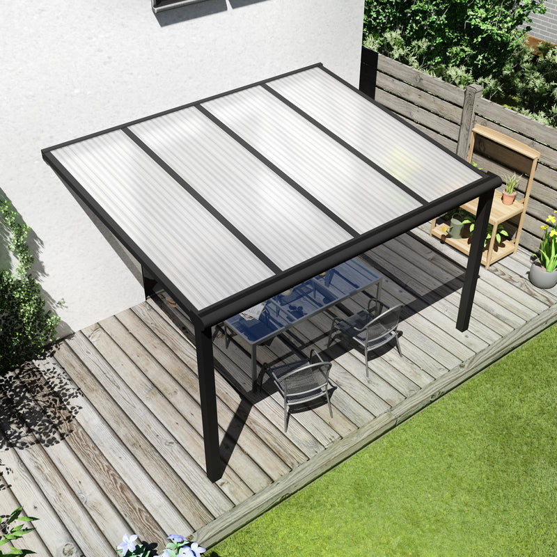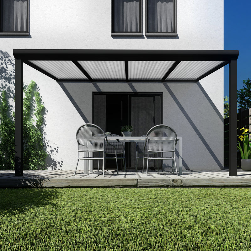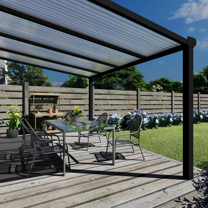 De Deluxe terrasoverkapping is tot in de perfectie afgewerkt en leverbaar tot een breedte van wel 7 meter uit één stuk. Deze Deluxe terrasoverkapping is in de kleur zwart en dakplaten van Helder polycarbonaat.